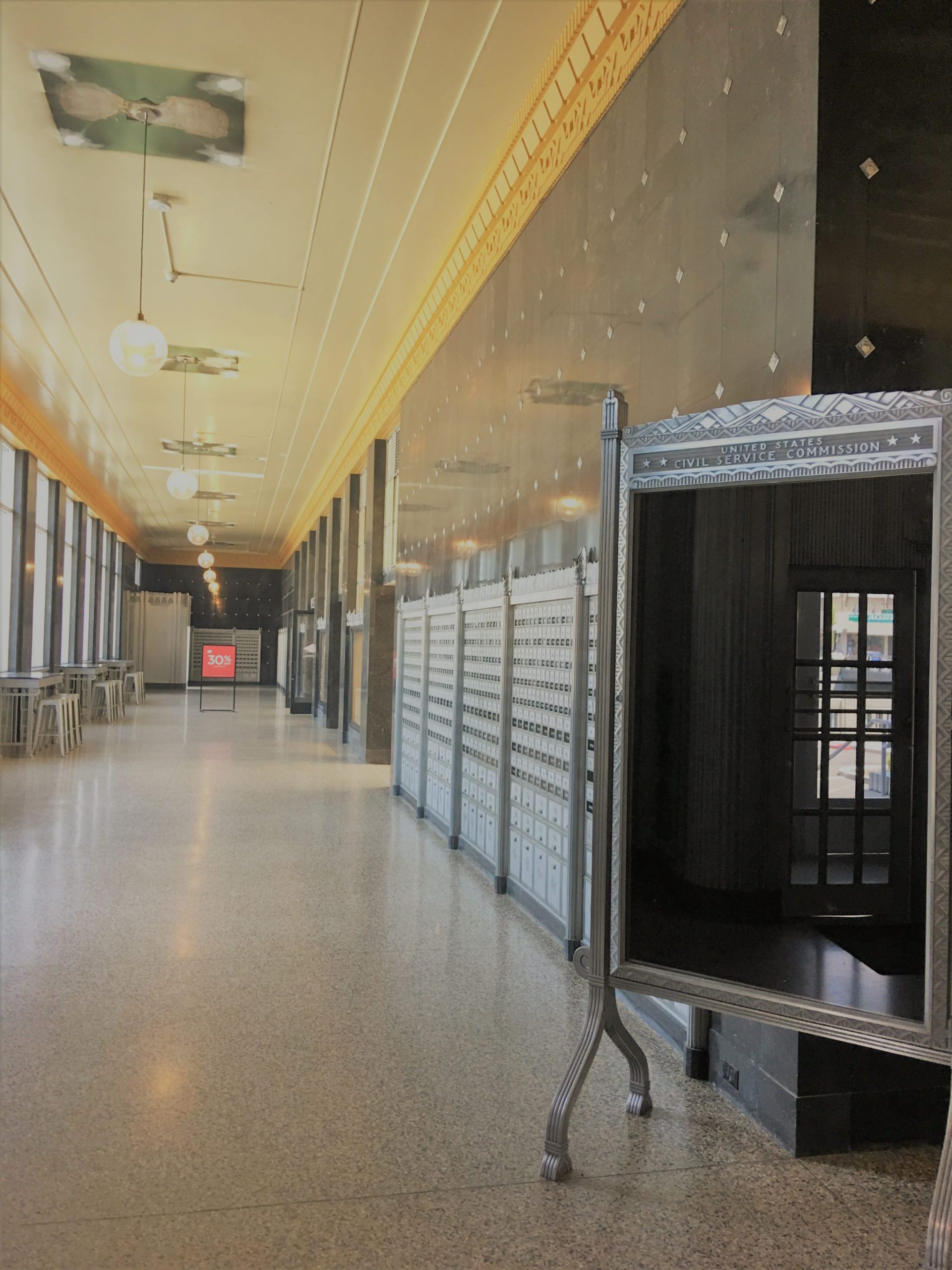 現在も使用可のレトロなアルミニウム製エレベーター。ドアの彫りが素敵。上階には農業省、復興省、労働局、退役軍人局、気象庁、FBI、税務庁、社会保障庁、海兵隊、海軍等々の支所や事務所がかつて入っていたそうです。現在はそれらは全て他所へ移設しており、一般民間企業が上階に入居するようです。