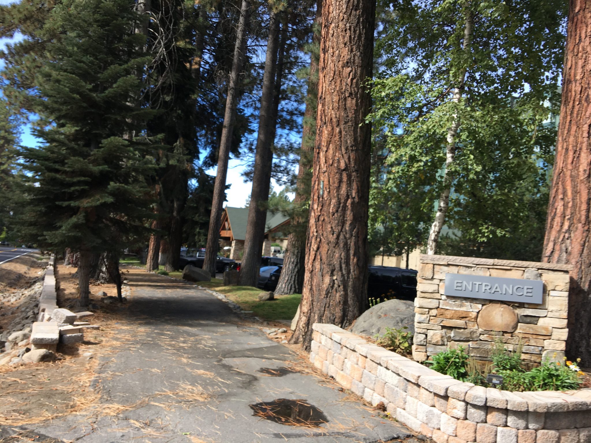ホテル正面玄関。Country Club Drive上、湖へ向かって右側にホテルへの入口があります。入口はうっかりして1回通り過ぎてしまいました。入口入って左の正面玄関前でValet駐車が利用出来(1泊$24)、入口入ってそのまま進むとSelf駐車が利用出来ます(1泊$18)。ValetはともかくSelfも駐車場代かかります。
