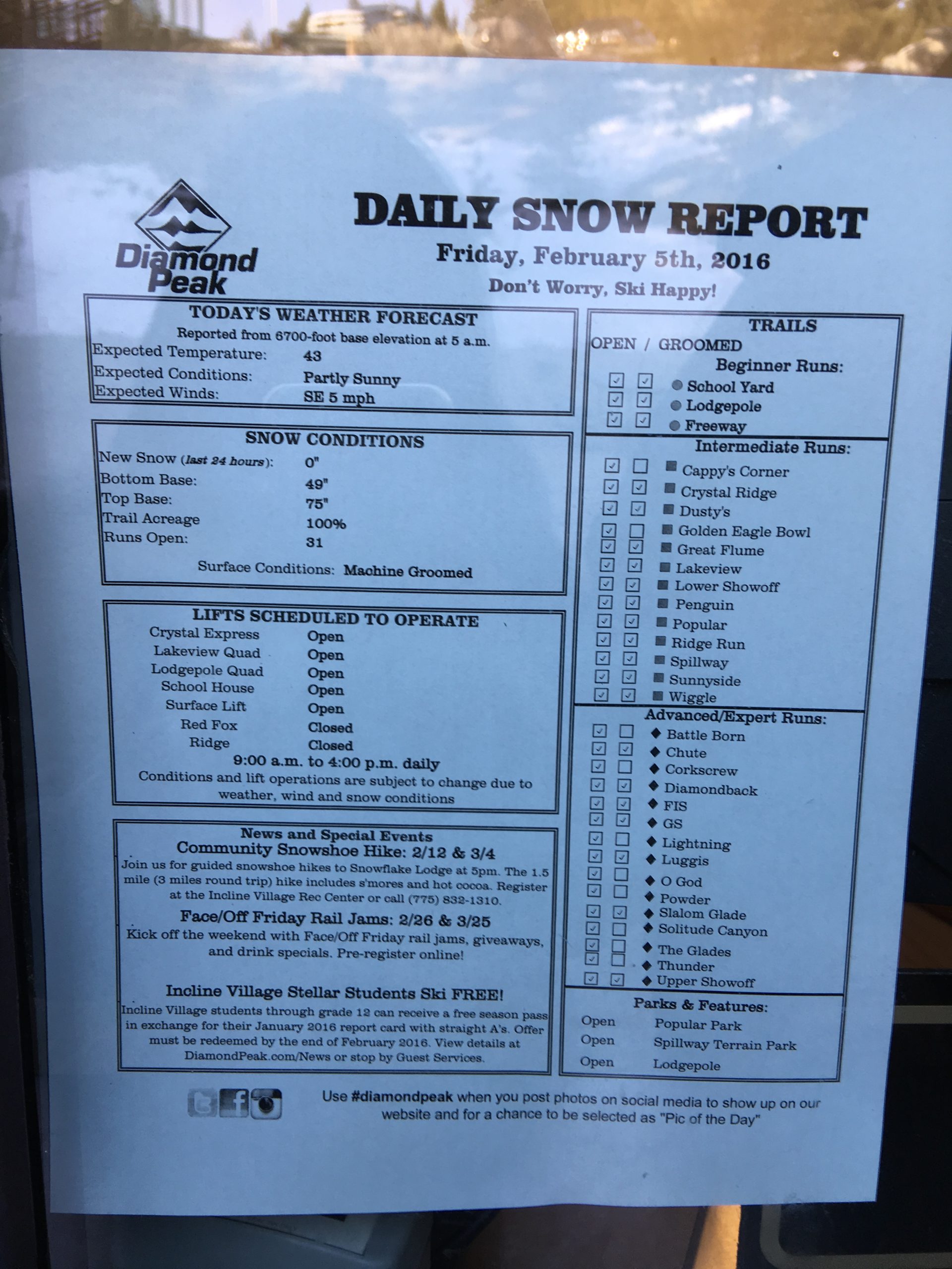 数あるスノー・リゾートの中でDiamond Peakに行った一番の理由は、リフト券料金。他リゾートが大人1日券$100前後のところ、ここは$64と良心的価格。もちろん、他リゾートよりかは小規模でリフトの数も少ないので、もしや安かろう悪かろうかな…っておもってたらそんな心配は全然無用なくらい期待以上に良かったです。小規模って言っても初級~中級レベルだと、一日いてものんびり滑れば飽きない程度のいいあんばいのコース内容かなとおもいます。楽しむコツはやっぱり、駐車場・チケット売り場・カフェテリア・リフト・ゲレンデ、と各所が空いててストレスフリーな午前中を攻めること!出来ればチケット売り場がオープンする8時の来場をおススメします。