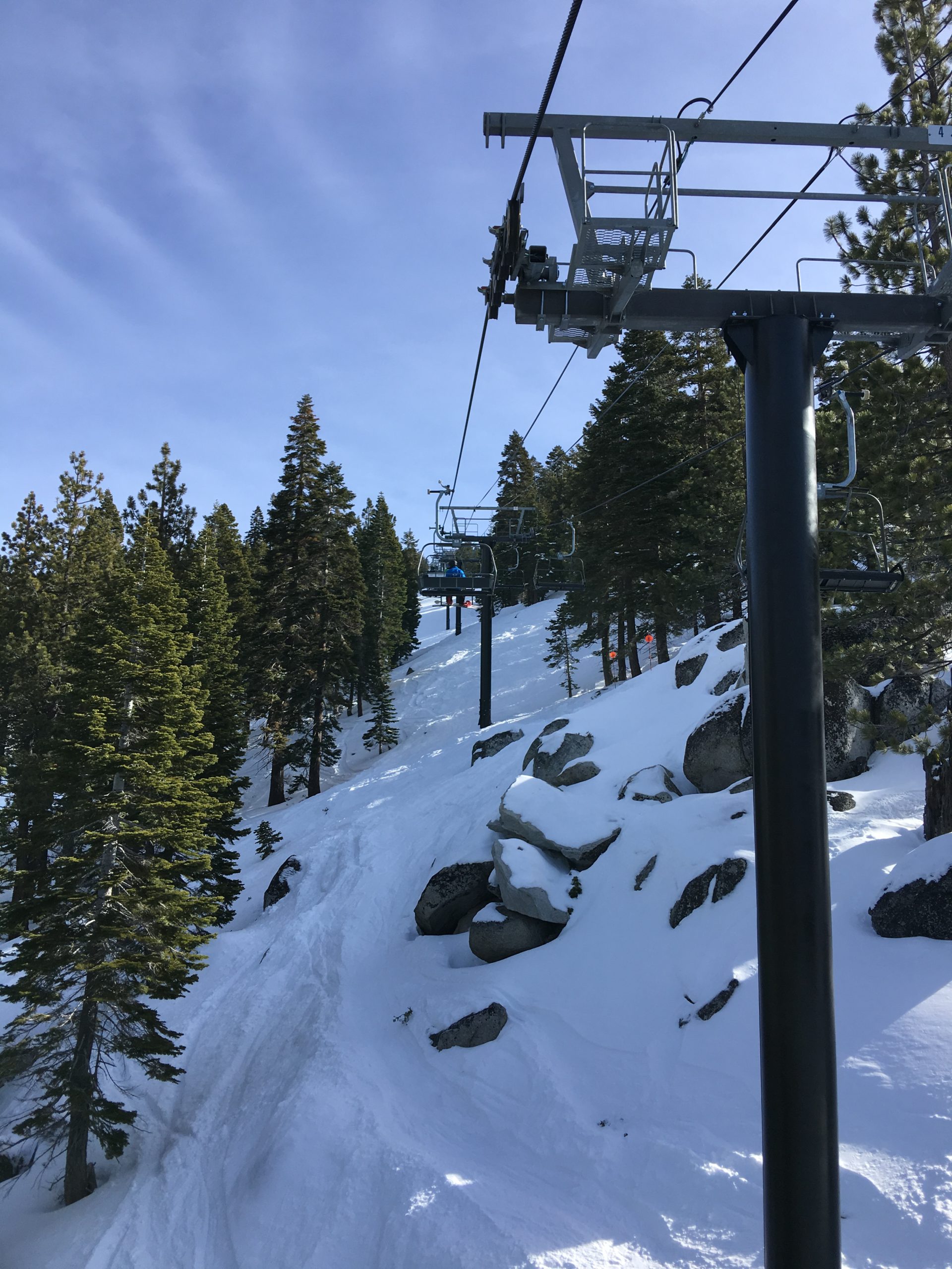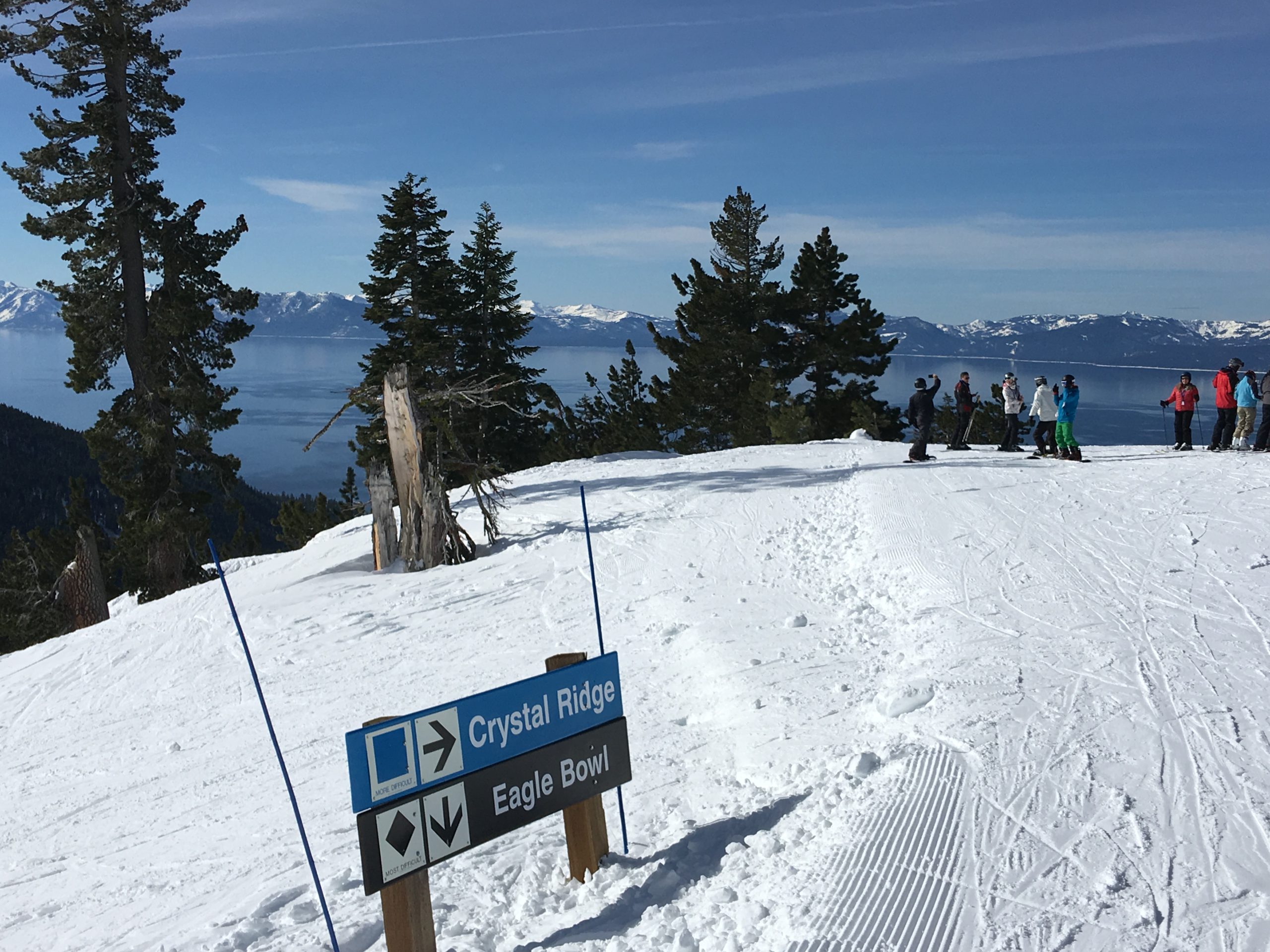 Snowflake Lodgeを出て中級コースのRidge Run~初級コースのFreewayを経てCrystal Expressリフトで山頂へ。さすが山頂、タホ湖ビューはさらに美しさがパワーアップされた息を呑む眺望でしばしうっとりと眺めを堪能。ず~っと眺めていても飽きなかったですが、湖を眺めながらのスキーもしないと!なのでCrystal Ridge方面へ。
