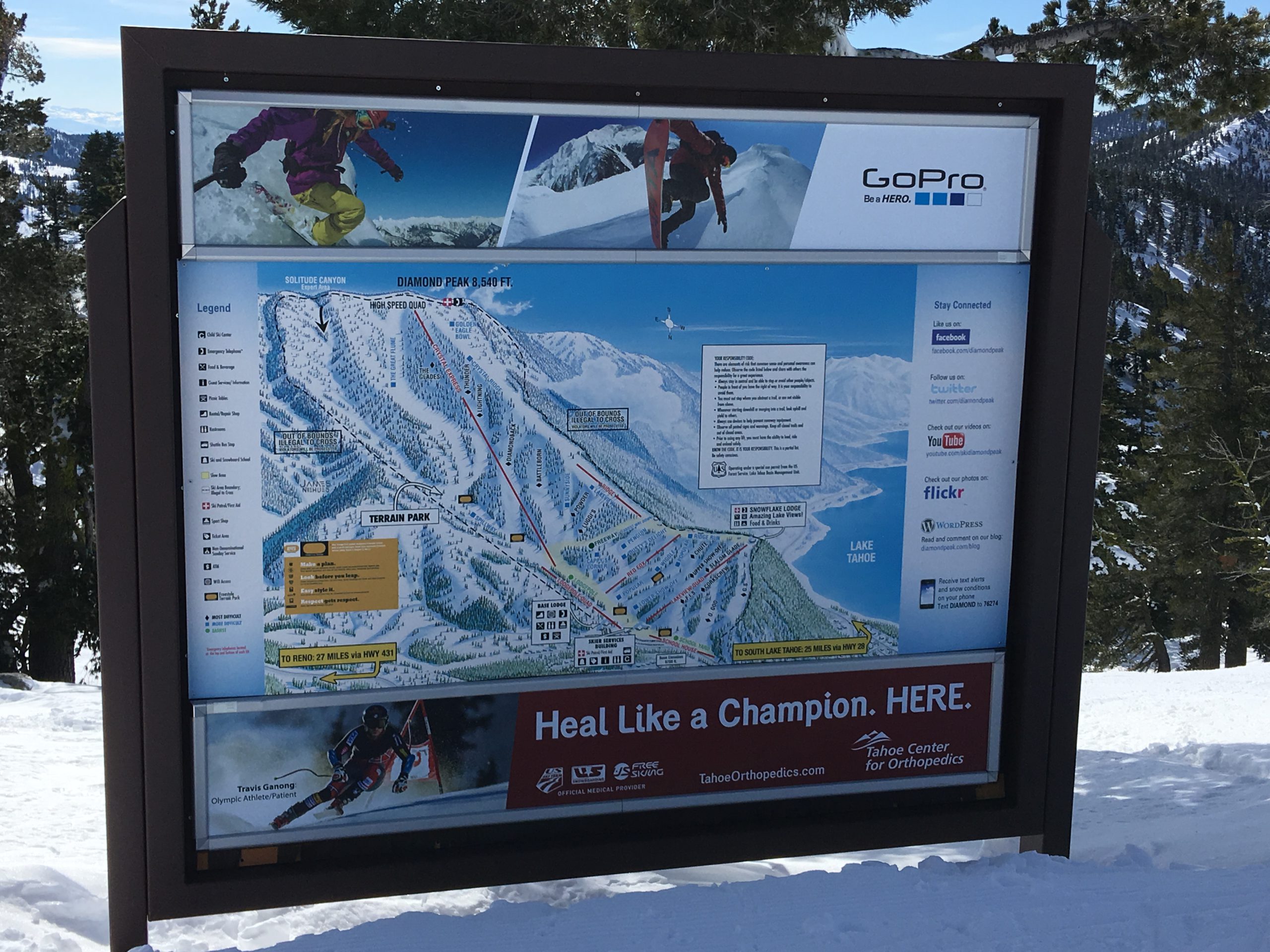 今冬は積雪が例年より多く、リノ・タホ―周辺のスキー場はどこもここ数年来久々の抜群のゲレンデ・コンディション。お天気と気温がマイルドな日を選び Diamond Peak Ski Resort へ。リノからMt.Rose Hwyのシーニック・ドライブを経てタホ湖もチラ見しながらスキー場へ。結構な降雪があった日から5日を経ていて道路はチェーン規制もなくクリアで安心ドライブ。リノ市内から小一時間もかからないでした。
