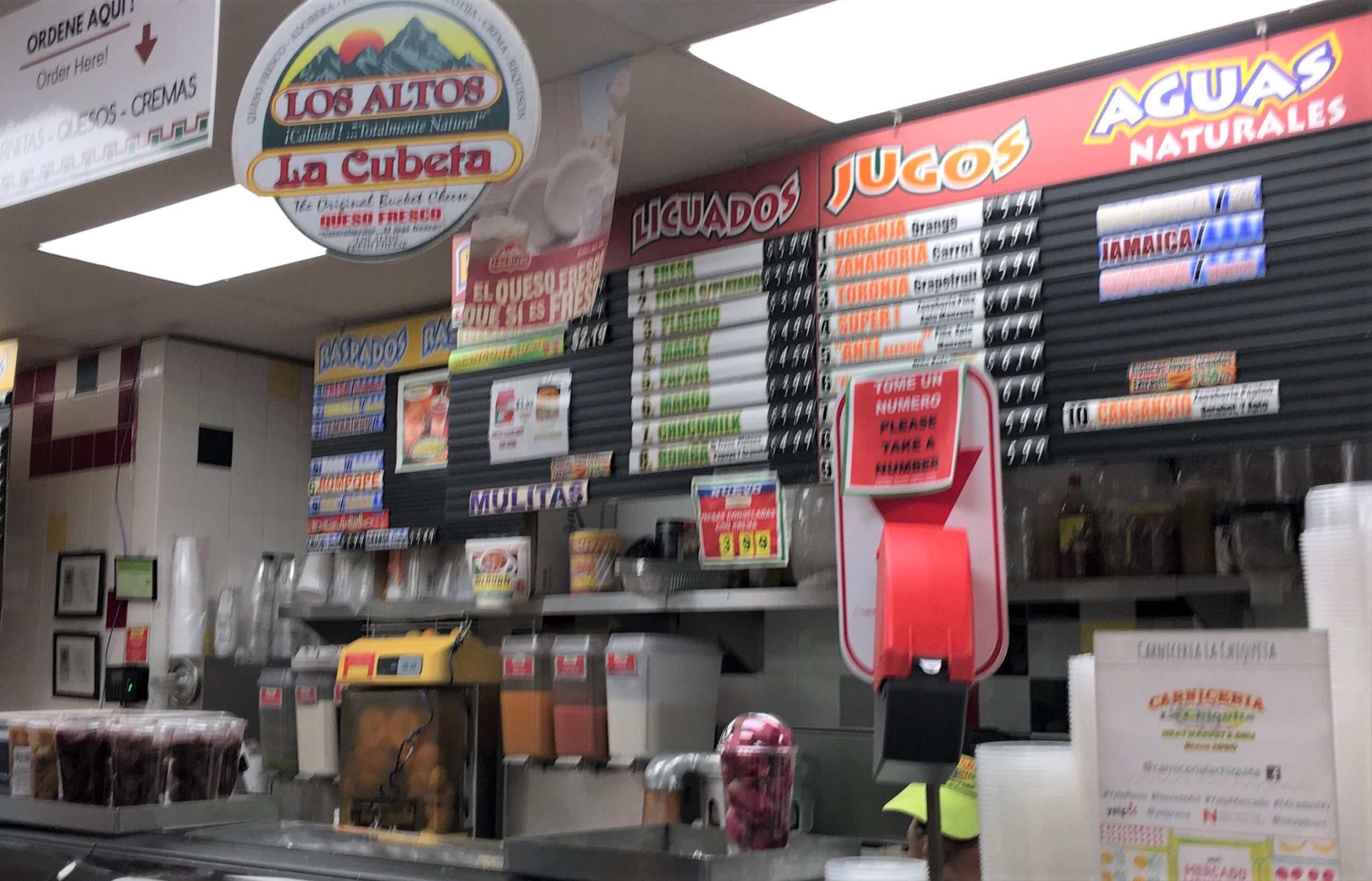 入口入って左はサンドイッチ(TORTAS)・惣菜・スムージーのコーナー。整理券をとり、電光掲示板に自分の番号が表示されたらカウンター左側で注文します。ここで注文したもののみ、ここで支払い、店内の他の食品等は入口入って右横の別のレジで支払うシステムになってます。メニューにあるスペイン語和訳(分かるもののみですみません)こちら↓ご参照下さい。